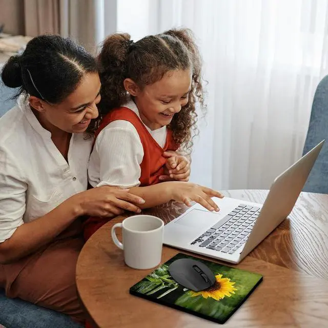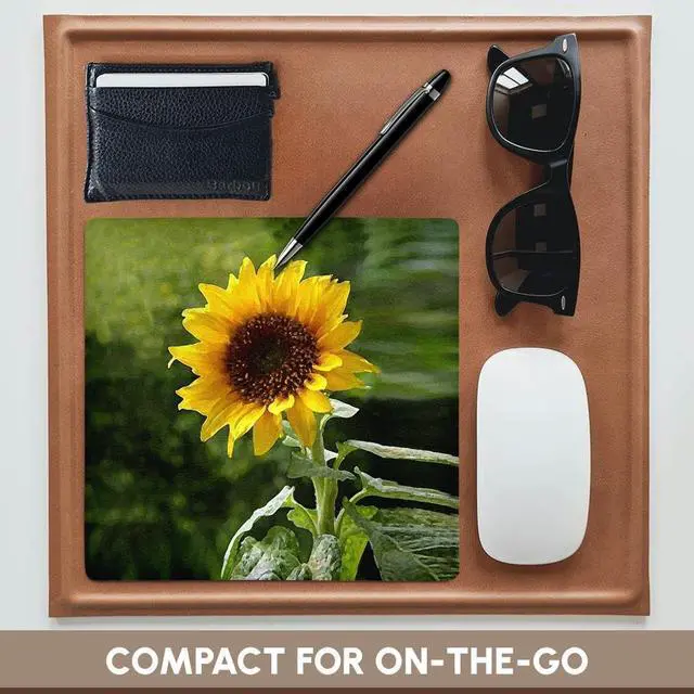 Sunflower Mouse Pad is 8" x 8" x. 25" and is made of heavy-duty recycled rubber. Matte finish image will not fade or peel. Machine washable using a mild detergent and air dry.