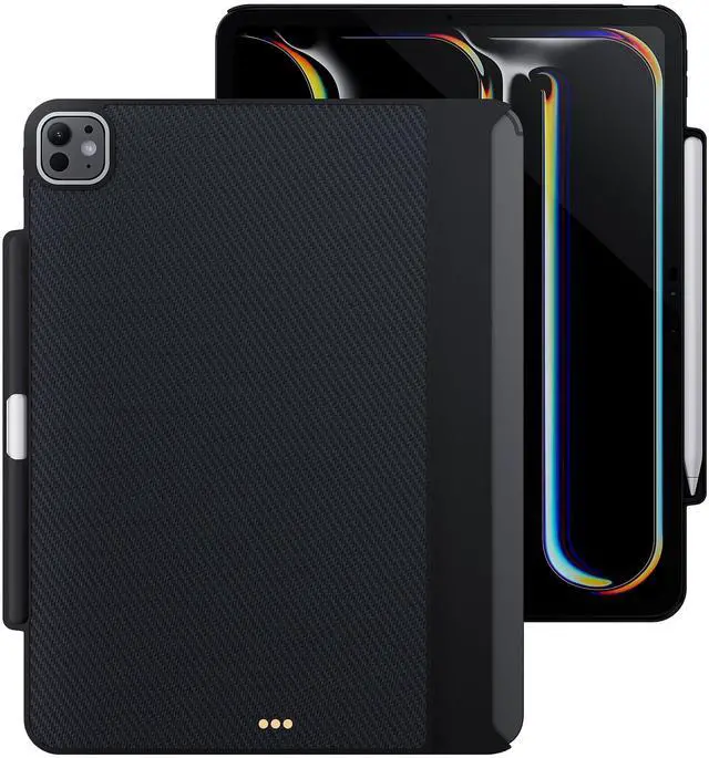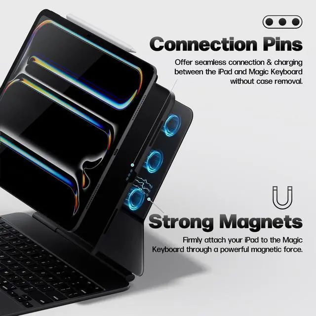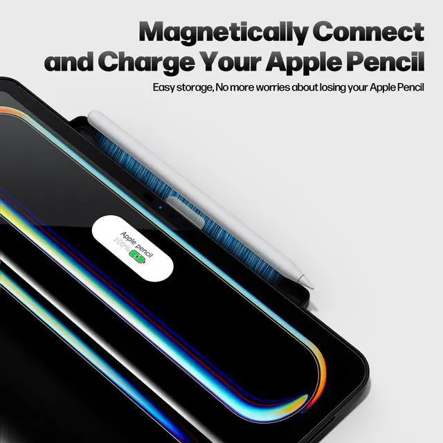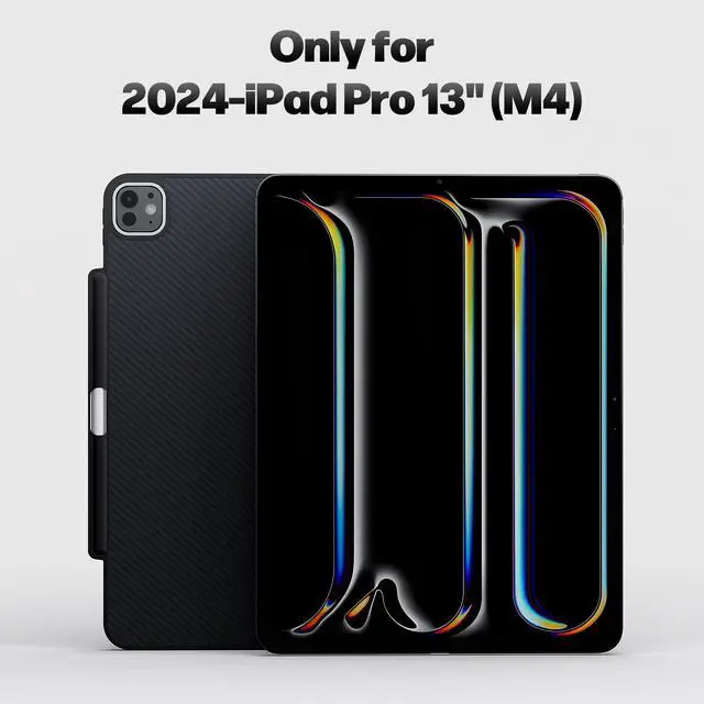 (Note: We do not recommend using a tempered glass screen protector for iPad, as it may prevent perfect keyboard alignment. ) ^^ Comprehensive Protection & Seamless Fit Three-sided wraparound design provides daily protection for the back and sides of your iPad Pro, preventing scratches. One side-open structure allows seamless integration between the iPad Pro and the Magic Keyboard. The metallic camera ring shields the lens from scratches. Precise cutouts offer easy access to all buttons, ports, speakers, and the camera, ensuring full functionality without obstruction. ^^ Pencil Slot & Charging for Apple Pencil Never lose your Apple Pencil again. The top of iPad case features a secure stable pencil holder allowing you to easily take the stylus out for use and store whenever needed. Supporting magnetic attachment and charging for your Apple Pencil Pro or Apple Pencil (USB-C). ^^ Ultra Silm & Portable The magnetic case for iPad Pro is made from lightweight, durable and deformation-resistant PC material, protecting your iPad from scratches and abrasions. The Kevlar-style carbon fiber-textured back adds a sophisticated touch. At just 0.05 inches thick and weighs 0.26 lb, this iPad Pro 2024 (M4) case is ultra slim and portable.