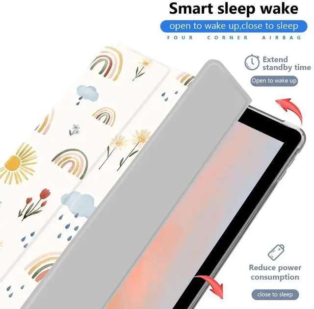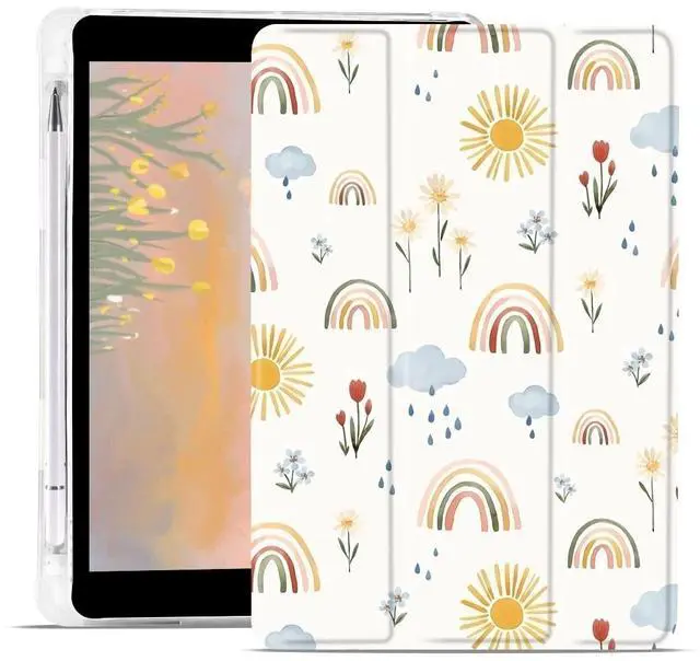 DescriptionThis cute Pad case with pencil holder designed for iPad Air 4/Air 5, 10.9 InchThe flower rainbow pattern iPad case white can be smartly folded, auto wake/sleepThe Soft TPU provides comfortable grip and scratch protection and protects wellThe tri-fold stand cover provides a convenient stand position for watching movies or typingThis unique and fashionable design case is a great gift for friends and yourself