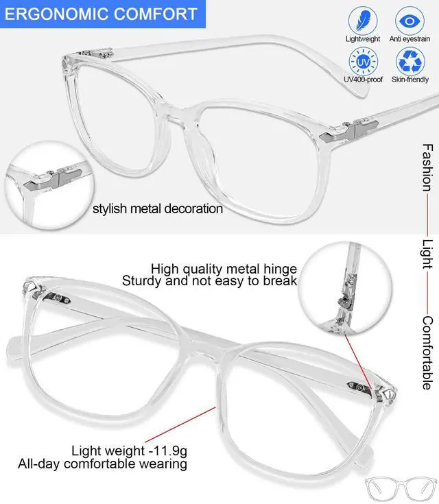 Efficient eye protection - Blue light blocking reading glasses women 1.0 reflect and filter blue light from digital screens( computer, phone, pad, TV, LED, etc. ), to reduce eyestrain and headache to help you sleep better! High-definition blue blocker lens has higher precision as well, perfect for long-term screen reading, working, watching show. ^^ Stylish design - Oversized square readers with trendy metal decoration make you more funky and chic; Modern transparent reading glasses 1.00 has large square shaped to modify your face shape and keep you look more professional and fashionable while reading, working, gaming at the office or party, at home or in bed.