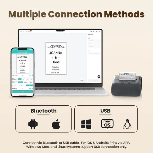 USB Connection: The SupDesk home label maker connects effortlessly to your phone via Bluetooth using App for iOS and Android. You can also print from your computer with a USB on Windows, Mac or Linux. It delivers stable, fast, and precise printing for every work. ^^ Dual-Mode Printing with