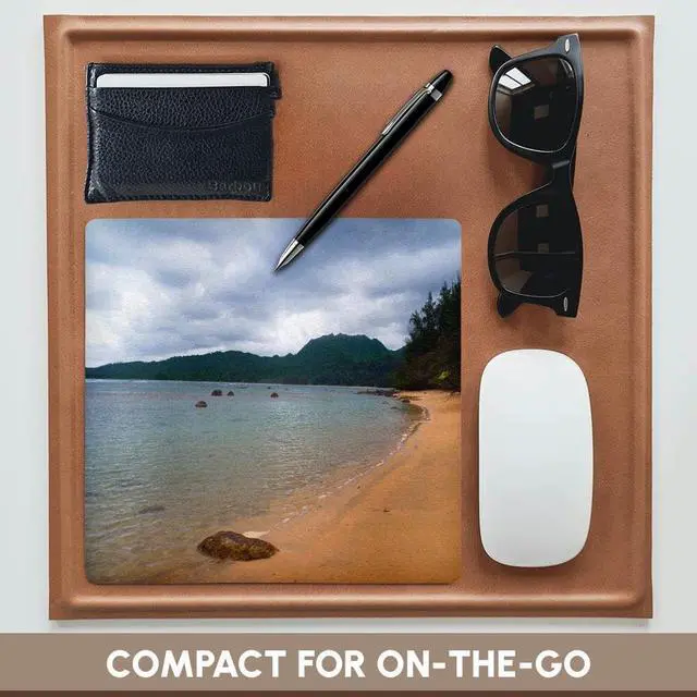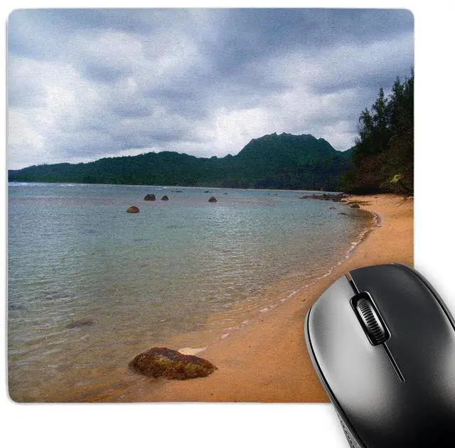Kauai Coastline Hanalei Bay Mouse Pad is 8" x 8" x. 25" and is made of heavy-duty recycled rubber. Matte finish image will not fade or peel. Machine washable using a mild detergent and air dry.