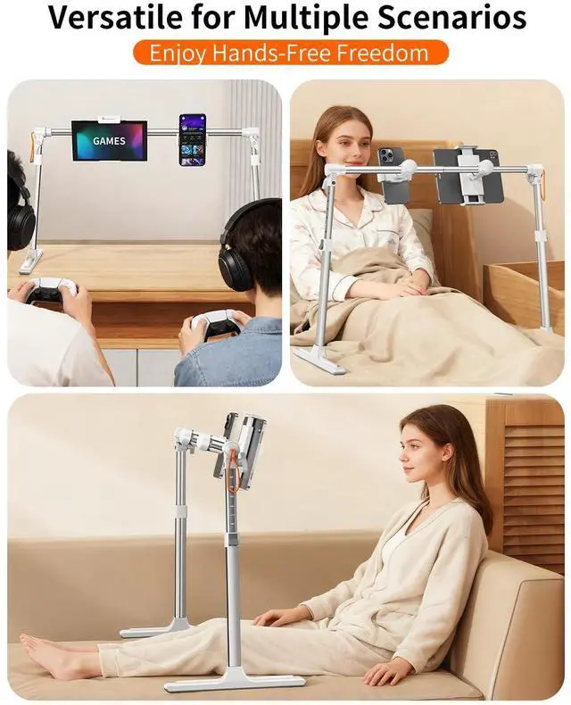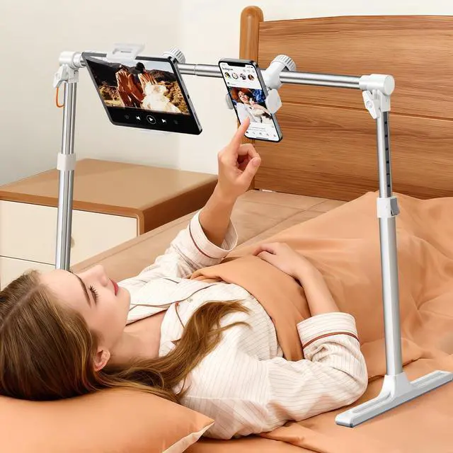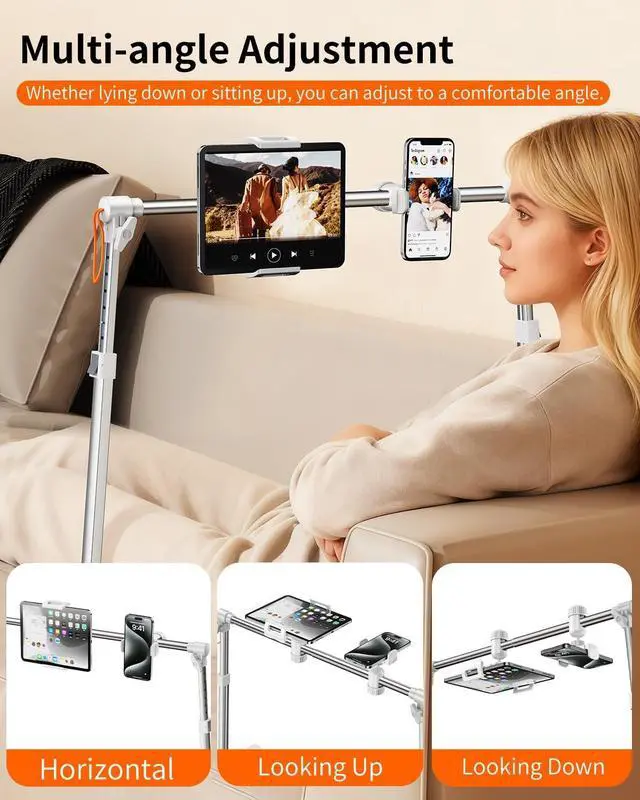 ^^ WIDE COMPATIBILITY: This phone holder for bed features two rotating clamps, accommodating devices ranging from 4.7 to 13 inches, including smartphones, tablets, and gaming consoles. It also supports simultaneous use of two devices, such as a phone and tablet, precisely adapting to various usage scenarios. ^^