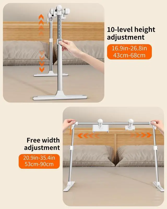 ADJUSTABLE HEIGHT AND LENGTH: This iPad stand offers flexible height and length adjustments. Height can be freely adjusted across 10 levels between 16.9" and 26.8". Length adjusts from 20.9" to 35.4". Whether reading in bed, working at a desk, or sharing viewing experiences with others, it precisely adapts to different scenarios and usage habits.