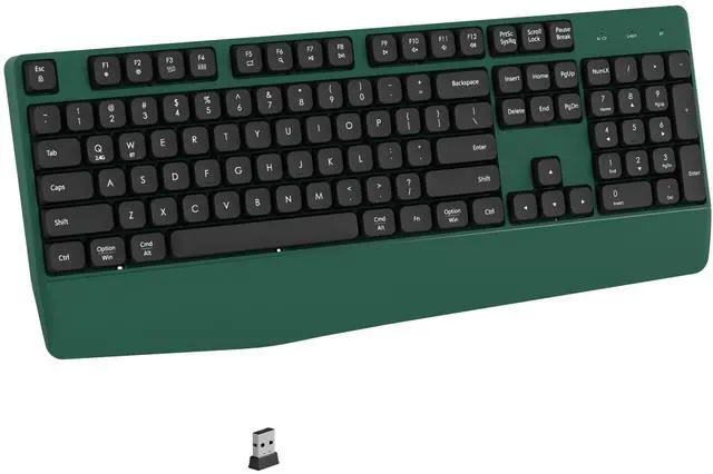 Our Bluetooth and USB dual-mode keyboard features a minimalist, elegant design that enhances your workspace. Its modern, professional appearance fits seamlessly in both office and home environments, adding both style and functionality to any setup. ^^ Designed for comfort, this full-sized wireless keyboard comes with a wrist rest to support a natural typing posture. Its ergonomic layout reduces strain during long typing sessions or extended work hours, making it ideal for those who spend a lot of time at their desk. ^^ With Bluetooth and 2.4G USB connectivity, easily switch between devices by either using Bluetooth or the included USB receiver.