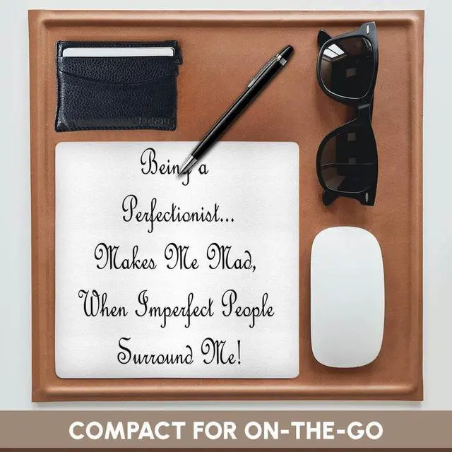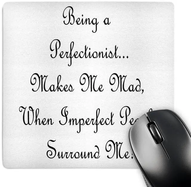 Being a Perfectionist Mouse Pad is 8" x 8" x. 25" and is made of heavy-duty recycled rubber. Matte finish image will not fade or peel. Machine washable using a mild detergent and air dry.