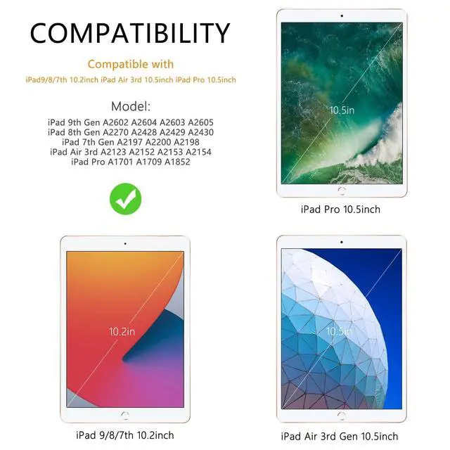 [iPad Keyboard Case Compatibility] This iPad keyboard case is designed for 10.2 inch iPad 9th generation 2021 (A2602/A2604/A2603/A2605), iPad 8th generation 2020 (A2270/A2428/A2429/A2430), iPad 7th generation 2019 (A2197/A2200/A2198), iPad Air 3rd generation (A2123/A2152/A2153/A2154) 10.5inch, iPad Pro (A1701/A1709/A1852) 10.5inch. Please check the model number on the back of your iPad before purchasing