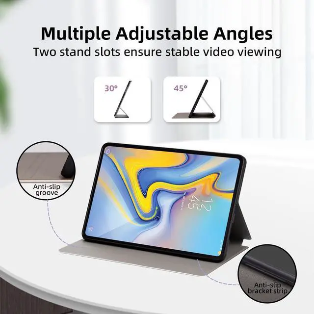 CompatibilityThis tablet case is only compatible Samsung Galaxy Tab A 10.5 2018 Released (SM-T590/ SM-T595/ SM-T597). Please check your tablet model before purchasing. More Power Saving and DurableThis case has automatic wake-up and sleep. Adjustable AnglesTwo Stand Slots Ensure Steady and SturdyShockproof ProtectionThe outer PU leather shell protects your Samsung Tab A 10.5 tablet from shocks, drops, and impacts.