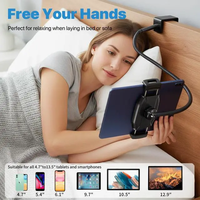 ^^ Powerful C-clip, easy and worry free installation The widened C-clip design is suitable for various countertops with a thickness of no more than 2.04 inches, and can be stably installed on desks, kitchen countertops, and fitness stands. The bottom is equipped with a thoughtful anti slip rubber pad, which protects the table from scratches and provides a more stable grip. ^^ Wide compatibility, easy to handle multiple devices supports various tablet and mobile devices ranging from 4.7 inches to 13.5 inches, covering mainstream models. A versatile device that can easily handle online classes, remote work, entertainment and movie watching.
