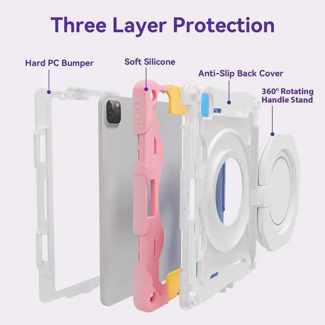 ^^ Three-layer Protective Structure: The three-layer structure of this ipad air 4th generation case provides comprehensive protection for your device. The outer layer is made of silicone, offering a soft, non-slip grip that not only enhances comfort during use but also helps prevent accidental drops. Beneath the silicone layer, the hard plastic back shell adds a robust defense against impacts and scratches, also features a shock-absorbing bumper that encircles the edges of the tablet, these three layers work in harmony to shield your tablet from damage while maintaining a sleek and functional design.