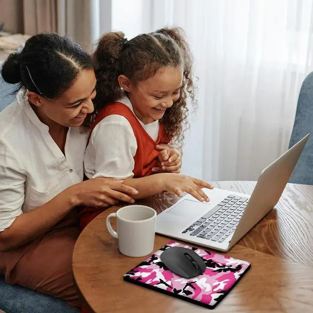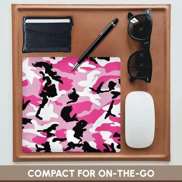 Pink Camouflage Print Mouse Pad is 8" x 8" x. 25" and is made of heavy-duty recycled rubber. Matte finish image will not fade or peel. Machine washable using a mild detergent and air dry.