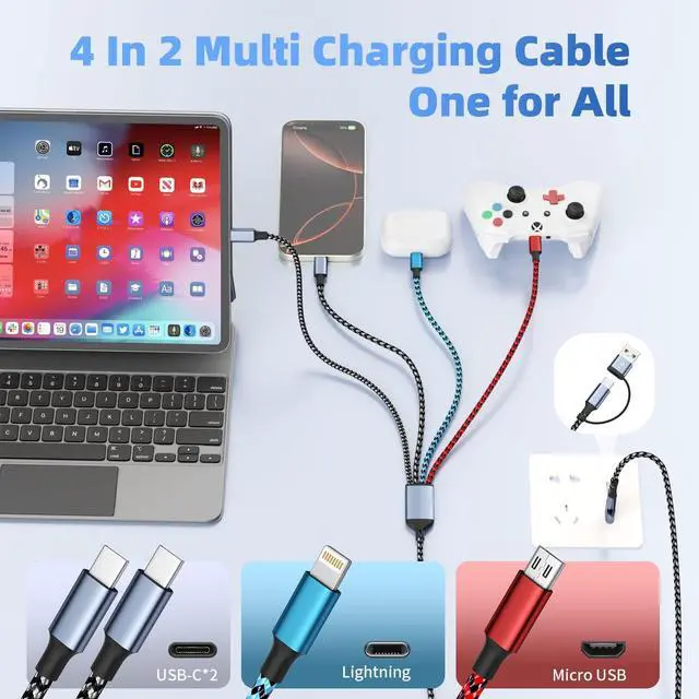long-term use (Note: Only the IP port supports 480Mbps data sync and CarPlay. ) ^^ [Durable & Tangle-Free Design] Chargers for multiple devices features braided nylon that perfectly fits your all devices while effectively prevents physical compression, providing extra durability and tangle-free convenience. travel charger for multiple devices with powerful military fiber, it withstands 1000N of force & 20, 000 bends (30x/day for 3 years)lasting far longer than standard usb charging cable. Your ultimate go-anywhere charging solution ^^ [ Wide Compatibility] This multi charger cable works seamlessly, whether you're using USB-A or USB-C power adapter. 4 in 2 multi charging cable compatible with all type-c/lightn-ing/Micro port devices, such as iPhone 17/16/15/14, iPad Air/Pro, iPod Touch, Galaxy S25/S24/S23 series, Note 7/8/9/10/20, Google Pixel, PS 4/5 controllers, portable fans, HTC, LG, Moto, external batteries and other Android devices for all mobile phone charging ^^ [Multiple Charger Cord Kit] Each pack includes 5ft 2pack USB A/C 4-in-2 multi charging cable with dual type c ports to charge your devices at ease. The lightweight, tangle-free design slips easily into bags, pockets, or backpacksmaking it a top choice for travel essentials for men, Uber drivers, and digital nomads.