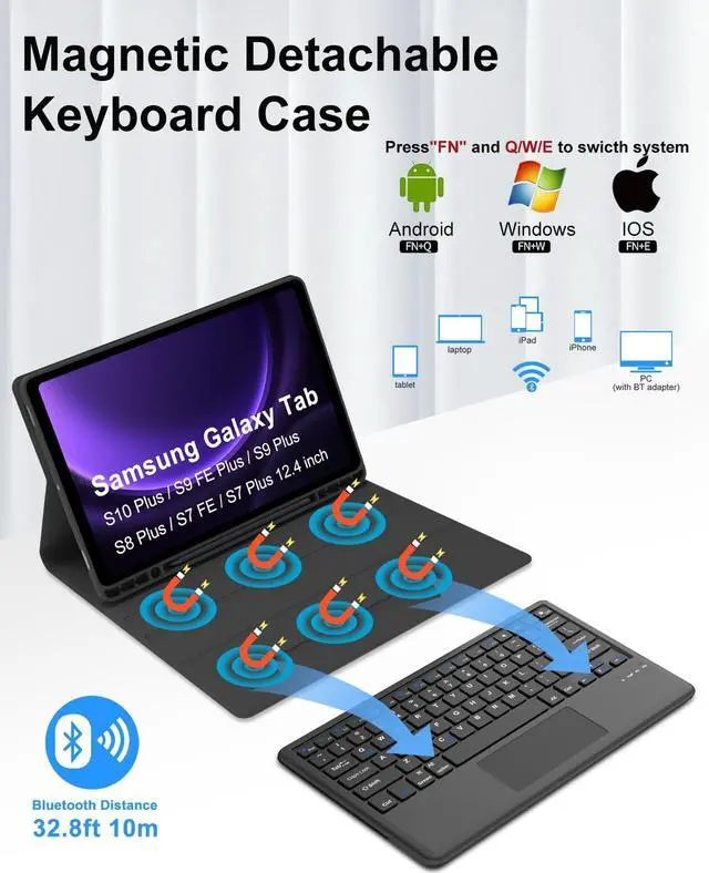 Magnetically Detachable Bluetooth KeyboardCase for Samsung Galaxy Tab S10 Plus / S9 Plus / S9 FE Plus / S8 Plus / S7 FE / S7 Plus 12.4 inch comes with a detachable magnetic keyboard. The ultra-thin and lightweight magnetic keyboard can be firmly attached to the case, which helps the tablet stand upright and turn it into a mini laptop in less than a second. You can move and change the keyboard position at any time according to your usual preferences.