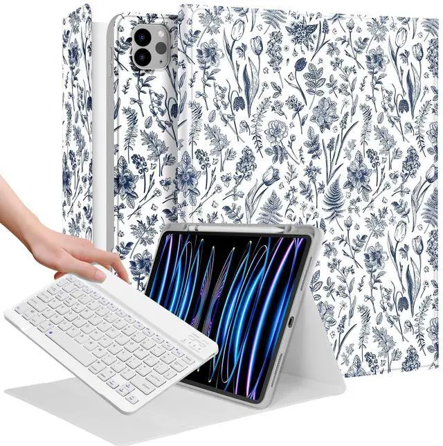 Wazzasoft for iPad Air 13 inch Case Keyboard M2/M3, for iPad Pro 12.9 Case with Keyboard Pencil Holder Folio Women Girls Cute Kawaii for Apple Tablet Cover Air 13, Pro 12.9 inch, Blue Flower