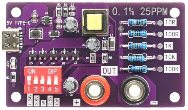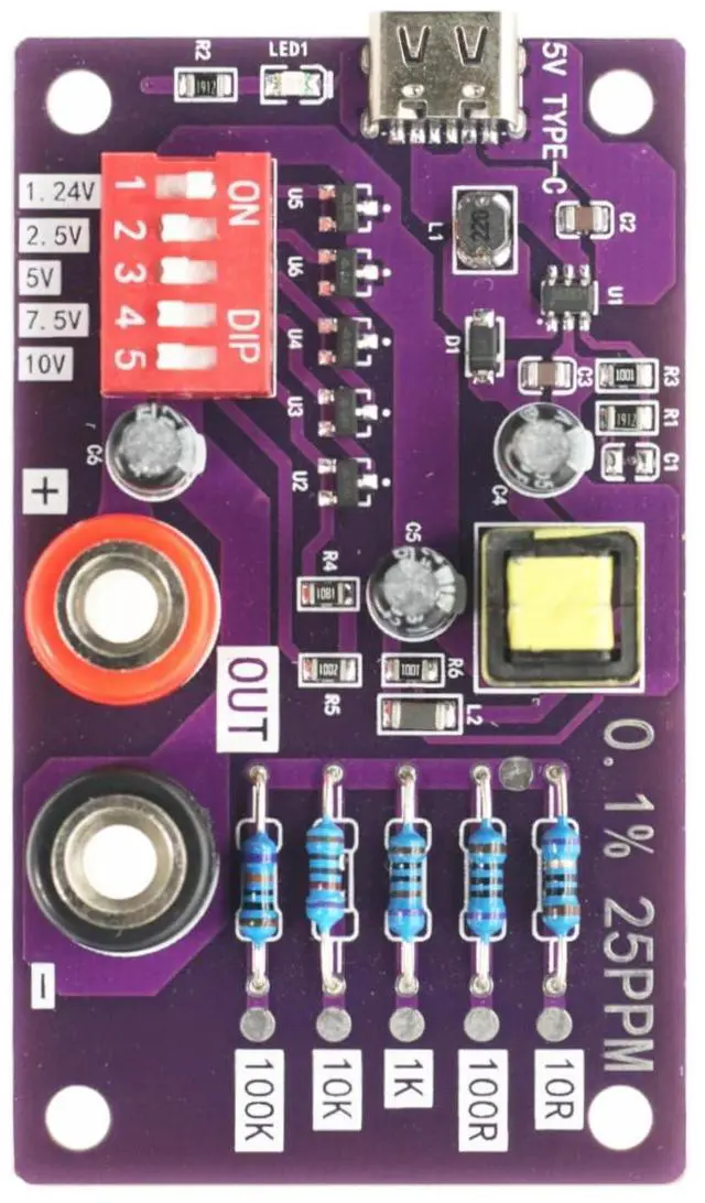 is a specially designed voltage reference module, it uses low-temperature drift components, Type C 5V port as power supply, uses EMI filter to make the power supply purer and smoother, no need battery to supply power.