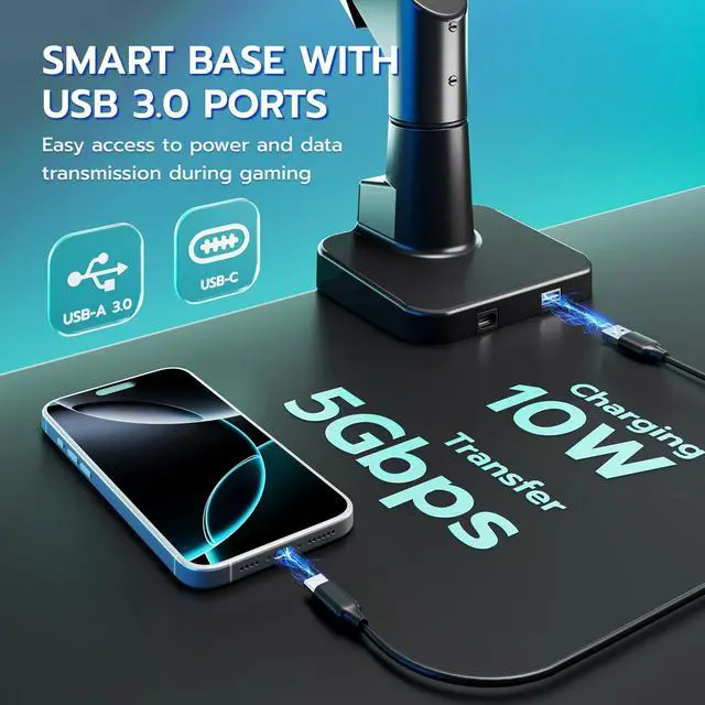 Upgraded Construction - Engineered with premium aluminum & steel arm and joints for ultimate stability, featuring an 20, 000-cycle tested gas spring system that reduce screen wobble during use. The 360 fully adjustable mechanism provides unprecedented positioning flexibility while maintaining rock-steady performance for long-term use. ^^ Smart USB IntegrationDesigned with a smart base with USB function, this heavy duty monitor arm helps you connect your devices easily and effortlessly. The built-in USB-A 3.0 and USB-C ports expand on the ports easily available to you on your desk, providing convenient options for charging and data transmission.