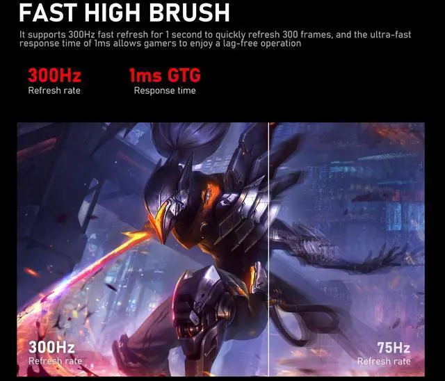 Excellent Gaming Monitor 24.5 -inch gaming display, built-in dual speakers, VA panel, with wide viewing angles, fast response speed, accurate colour reproduction and other advantages, with 19201080p resolution (FHD), 8Bit colour depth, 98% sRGB smooth and natural transition picture experience, bringing a distortion-free image experience. ^^ 300Hz quite fast and fluidGame confrontation depends on the reaction speed of each operation, high refresh rate of 300Hz(HD MIup to 120 Hz, DP up to 300 Hz), the image is smooth and delicate, eliminates the feeling of lag, combined with a gtg response speed of 1ms, eliminates streaks generated by high moving images, the game image is fluid and kardon-free, the battlefield is under your control ^^ Low blue light, non-flickering screenThe use of DC global dimming technology, can realize a high-brush non-flash screen, after activating low blue light mode, can effectively filter short-wave blue light, prolonged use of the eye remains comfortable.