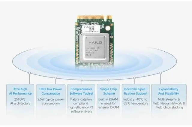Features At A Glance Hailo-8 AI M. 2 modulePowered by 26 Tera-Operations Per Second (TOPS) Hailo-8 AI Processor 2.5W typical power consumption Scalable, enabling simultaneous processingof multi-streams & multi-models Enabling real-time, low latency and high-efficiency AI inferencing on the edge devices Supports TensorFlow, TensorFlow Lite, ONNX, Keras, Pytorch frameworks Supports Linux and Windows Supports the temperature range of -40C to 85C PCIe To M. 2 adapterOnboard power monitoring chip and EEPROM, supports real-time monitoring of device power status for more stable operation Raspberry Pi HAT+ compliant Reserved airflow vent, supports installing cooling fan for better heat dissipation of the AI module to improve performance Immersion gold process design, anti-oxidation and more durableHailo-8 AI M.