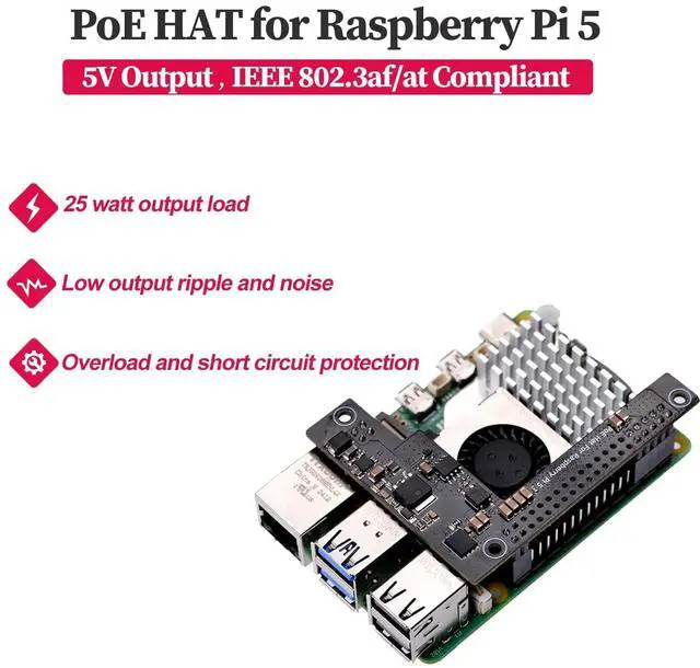 5. The Raspberry Pi can get power and network from this POE HAT, by connect to IEEE 802.3 af/at PoE switch with RJ45 Ethernet cable. Easy installation and low cost (isolation type and minimum external device required). FeaturesFully IEEE 802.3 af/at compliant25 watt output loadIEEE Power class programmable (Green) 1500 Volt DC isolation (Input to Output) 5V output voltage modelsOverload and short circuit protectionWide input voltage (36V to 57V DC) Support PoE applications in both of Fast / Gigabit Ethernet environments. Low output ripple and noiseRoHS