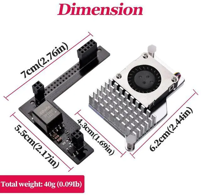 HAT Dimension: 70 x 55 x 16mm( 2.76 x 2.17 x 0.63 in)Weight (Include cooler): 40g ( 0.09I b)Package