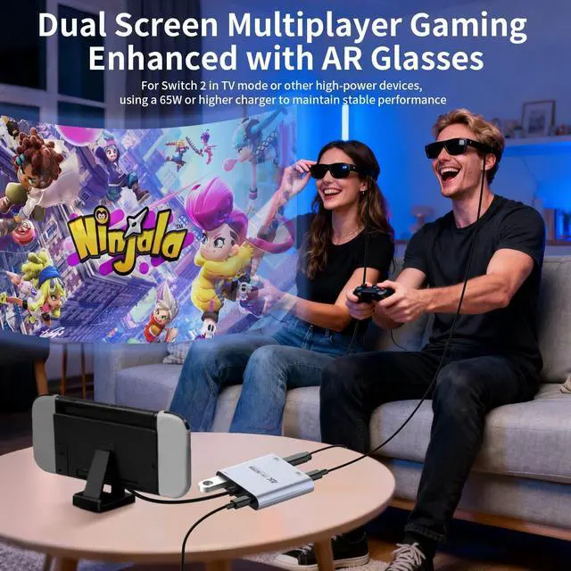Dual Screen Multiplayer Gaming with AR GlassesSupports dual-screen output for Switch 2 at up to 4K@60Hz, allowing two players to play simultaneously on separate AR glasses while keeping the main screen for other tasks. Ideal for immersive multiplayer gaming and shared entertainment on portable monitors or AR device, making this USB-C Hub good for gaming setups. ^^ Full-Function Type-C PortsSupports up to two displays via dual Type-C ports, with both ports also supporting data transfer and PD charging. This USBC display adapter allows full-function usage for device expansion or screen mirroring. When two screens are used simultaneously (4K + 1080p), the system will display at the lower resolution (1080p).