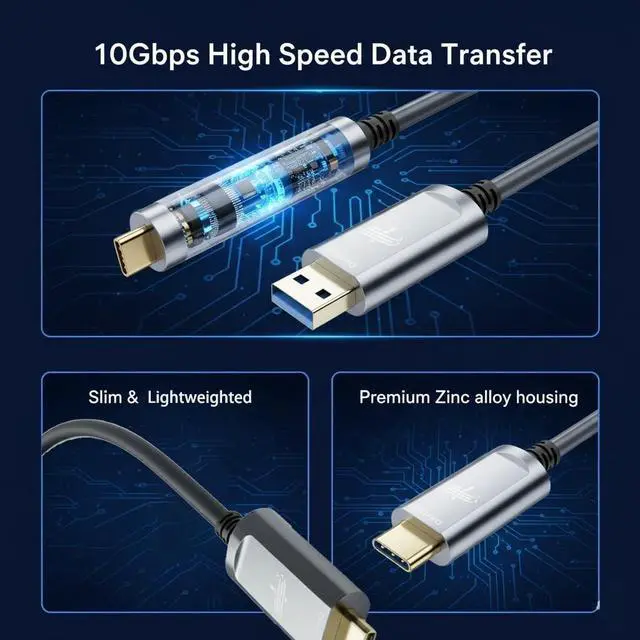 ^^ Built for Decade-Level Durability Designed for demanding work environments: Zinc alloy shell for heat dissipation and EMI shielding 24K gold-plated connectors for anti-oxidation Reinforced optical fiber core for flexibility Dual protective coatings for long-term reliability Lightweight, flexible, and engineered to last through years of heavy business use. ^^ Slim, lightweight fiber construction and a flexible jacket make this USB A to USB C cable easier to pull through conduits, route in ceilings or walls and manage inside racks, supporting clean, professional installations for integrators and IT teams. ^^ Backed by a 2year business after-sale service for continuous operation in conference rooms, data centers and industrial systems