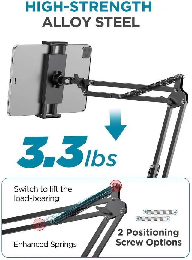 Durable & Heavy-Duty Construction: Constructed from premium steel, this tablet mount is equipped with robust springs and an additional positioning hole, offering a remarkable load-bearing capacity of 3.3 lbs ( 1.5 kg), exceeding the standard 2.2 lbs ( 1.0 kg). The InnoGear boom stand ensures smooth and quiet adjustments, providing reliable performance.