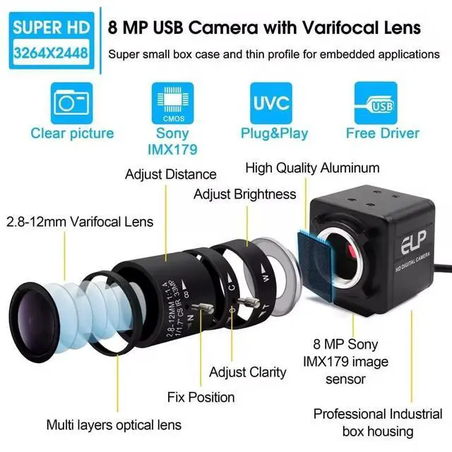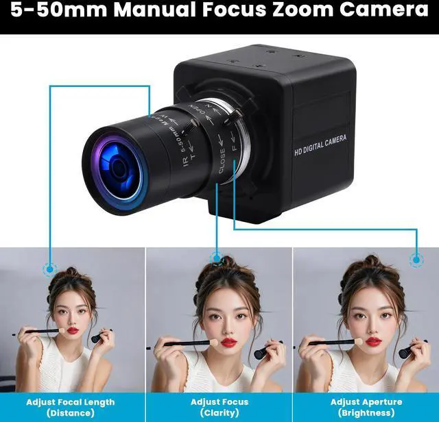 8MP Ultra-HD Imaging 32642448 resolution captures 0.1 mm-level details (e. g., PCB solder joints) with MJPEG/YUY2 formats, ideal for industrial quality inspection and high-precision imaging. ^^ 10X Optical Zoom Lens 5-50mm manual varifocal CS lens supports seamless switching from 5mm macro (barcode scanning) to 50mm wide-angle monitoring, with lock design to prevent focus shift from vibrations. ^^ Plug & Play Multi-Platform Compatibility UVC-compliant for Windows/Linux/Mac/Android (with OTG), directly compatible with Raspberry Pi for makers and industrial development without drivers. ^^ Professional Parameter Adjustment Customize 10+ parameters (brightness/contrast/white balance) to optimize performance in low-light environments ( 0.3L ux) or for color-accurate scenarios.