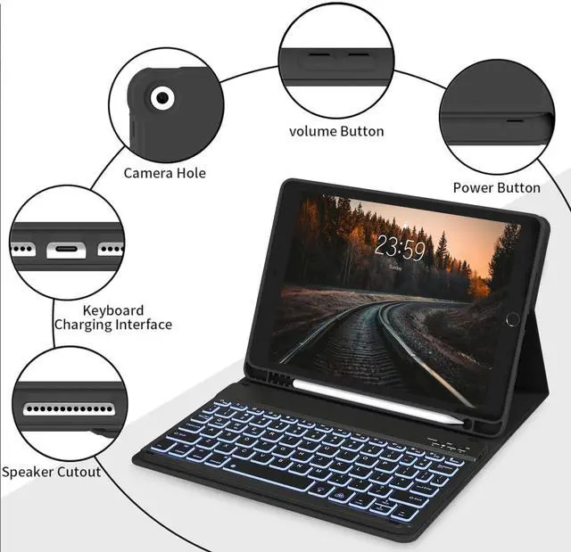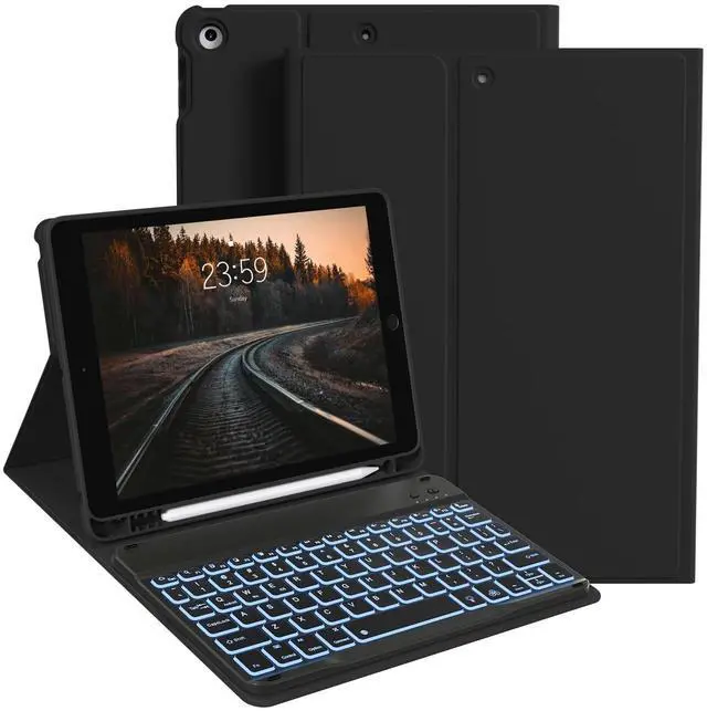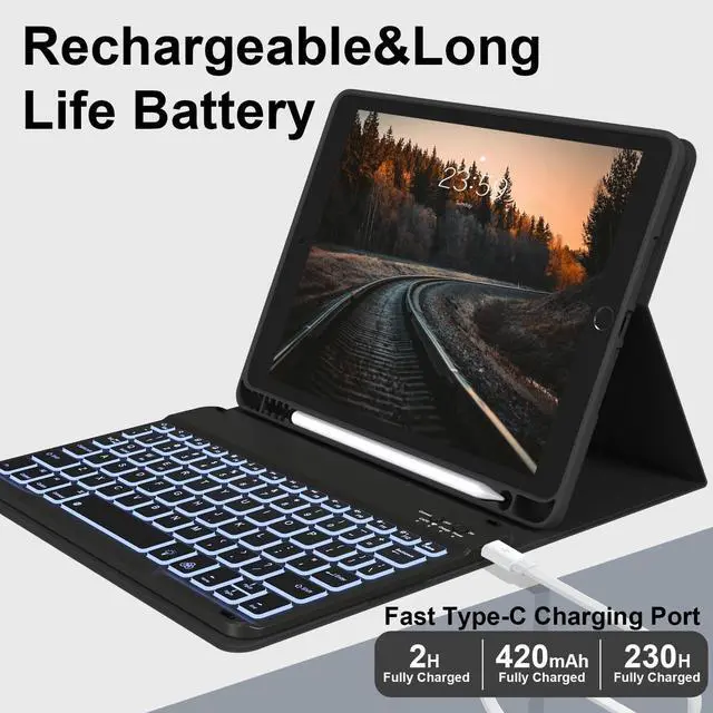 • 7 Colors Backlit Detachable Keyboard: This for ipad 9th/8th/7th Generation Keyboard Case features laser-etched illuminated keys and offers 7 LED backlighting colors and allow vibrant colors to shine in the dark, 3 brightness options for a comfortable typing experience even at night. Greatly improved your iPad productivity. When not needed, the keyboard can be detached and the iPad case or keyboard can be used independently