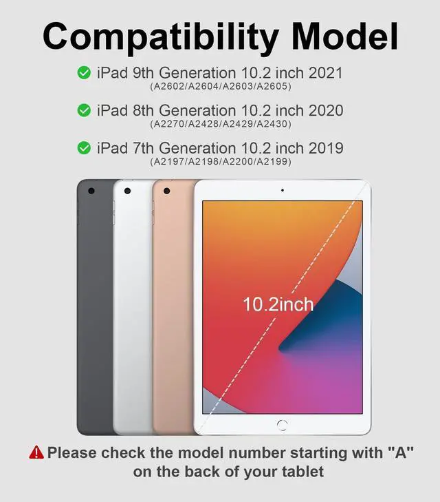 • For ipad 9th/8th/7th Generation Case with Keyboard: This iPad Keyboard Case is designed for iPad 9th / 8th / 7th Generation 10.2 inch 2021 / 2020 / 2019. (Model: A2602 A2604 A2603 A2605 A2270 A2428 A2429 A2430 A2197 A2198 A2200 A2199). It is not compatible with any other models, Please check the model number starting with "A" on the back of your tablet before purchasing