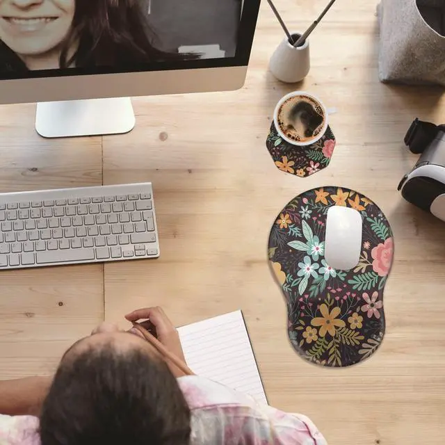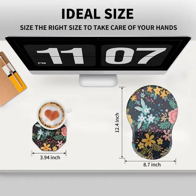 Unique Shape and Size-- 13x 8.66 x 0.86 inches; Coffee Coaster 4" x 4" x 0.08" mouse wrist rest pad fits all types of mouse, wired, wireless, mechanical, laser & optical. The reinforced edges of mousepad prevent deformation and damage to guarantee long term use. High quality materials-- This mouse pad is made of memory foam with no additives or fillers. And the cover is made of soft and smooth fabric, no irritation to skin, is able to track the mouse movements fast and accurate. Not easy to curl up on the edges even after long time usage.