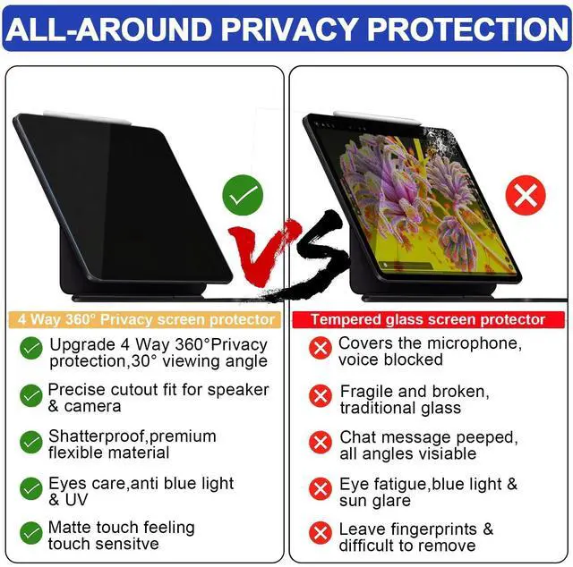 ZQCFKJ 360 Degree Matte Privacy Screen Protector only fits Apple iPad Air 10.9 -inch(2022/2020 Release, 5th/4th Generation) and iPad Pro 11-inch2022/2021/2020/2018 Release, 4th/3rd/2nd/1st Generation). Tablet computer privacy filter is designed to prevent identity theft from shoulder surfing and visual hacking your private on-screen information from viewed or photographed. ZQCFKJ 4-Way 360 Degree iPad Privacy Screen is suitable for a variety of public places, business meetings, open-style offices, financial institutions, cafes, airplanes, trains etc., protects your sensitive information, your passwords, personal content etc., which might be leaked.