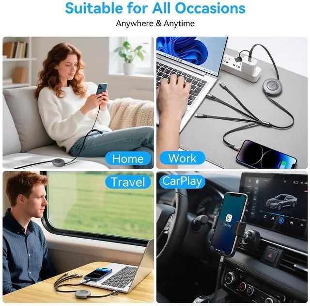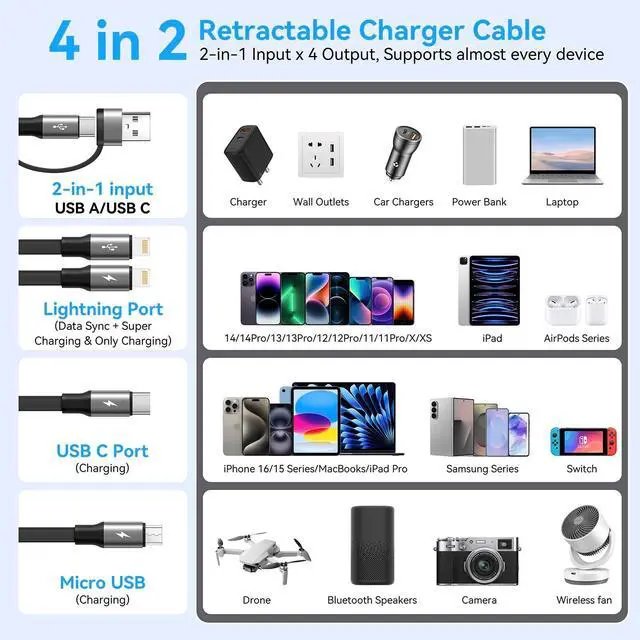 All Devices: The up-to-date 4 in 2 retractable design with USB A/C to 4 different USB ports. Including Dual Lightning, Micro-USB and USB Type C connectors support to charger most of the cell phones available on market. Perfect for home use, office, travel, car, uber lyft business or sharing with friends. ^^ Travel Charger and Adjustable LengthMINLU USB A/C retractable car charger cable offers four stretching lengths: 1.5 ft, 2.6 ft, 3.3 ft, and 4ft, accommodating different daily scenarios. The retractable cord that is close in size to airpods can be easily stowed in a handbag, laptop bag or pocket. Bring one multi charger cable, meets all your demand. ^^ Charging Fast and
