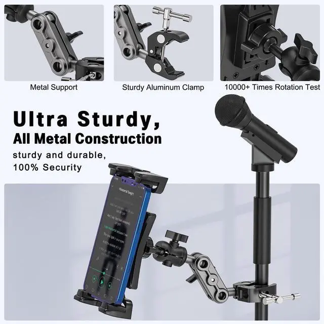 ^^ Ultimate Viewing Freedom: The metal ball head attached to this tablet holder can be rotated 360 degrees(vertically/horizontally). And the angle of the metal arm can be adjusted 180 degrees or rotationed 360-degree by adjusting the knob. Whether you're talking on the phone while exercising, watching a video, or following a score during a stage performance, the angle can be adjusted without any tools, so you can enjoy the perfect viewing angle while exercising or performing.
