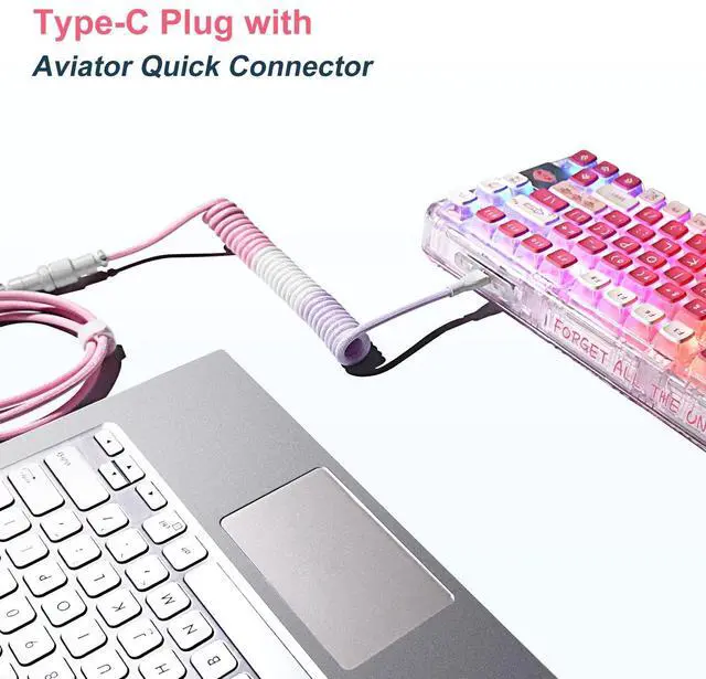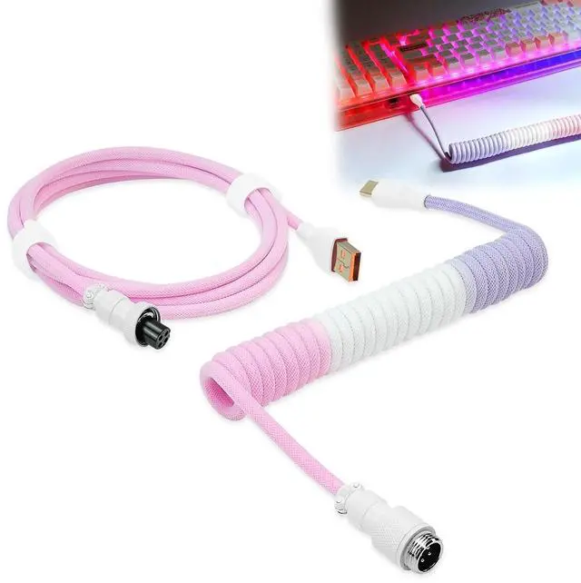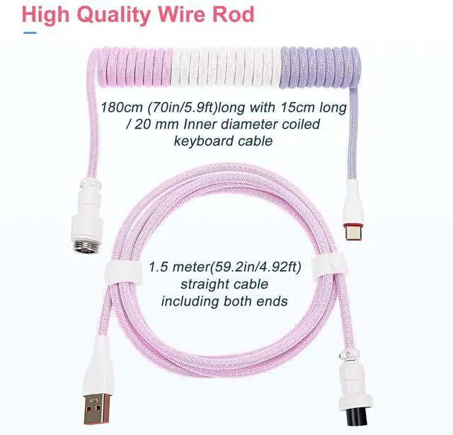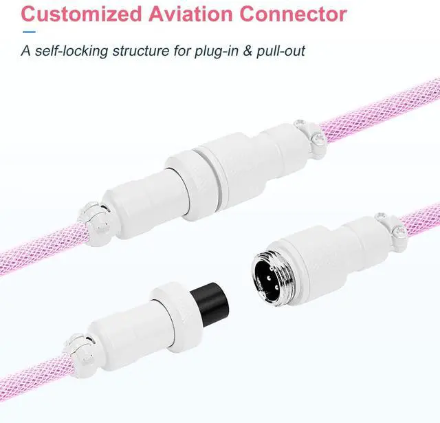 Rugged & Durable QualityUCINNOVATE custom coiled keyboard cable enhanced with double-sleeved custom coiled keyboard cable, using high-quality copper wire with aluminum shielding foil, strong and durable material that is not afraid of bending and not easy break. ^^ Detachable Metal Aviation Connector This pilot connector adopts a detachable design, which can be plugged and self-locked. You can connect different cables to the keyboard or other accessories. ^^ High Speed Charging & SyncThis aviator connector allows you to quickly attach different cables to your keyboard or other accessories. It also adds texture to your desk setup and makes your keyboard look awesome! ^^ Durable Dual Braided SleeveProfessional reverse winding coil technology makes the coiled usb c cable have a better rebound effect, preventing the coil from being damaged by excessive stretching.