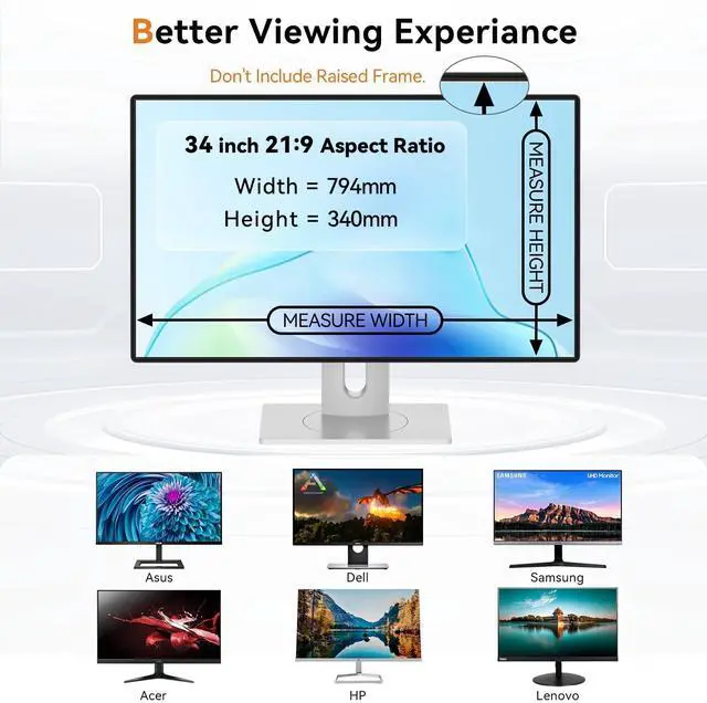 Aspect Ratio: 21:9. Mamol computer blue light filters are engineered for perfect compatibility with HP, Samsung, Dell, Lenovo, Acer, Asus, LG, ViewSonic and other major monitor brands. Always verify your screen's width and height measurements before purchasing. For any dimension-related inquiries, our customer service team is ready to assist you. ^^ ENHANCED EYES PROTECTION This blue light blocking screen significantly reduces eye strain and minimizes potential vision hazards. It effectively filters 99.9 % of UV rays and blocks 98% of harmful blue light. This 34inch blue light screen filter also minimizes glare and distracting reflections, ensuring comfortable viewing. Perfect for all your daily needs whether for work, gaming, or entertainment. ^^ BETTER HD CLARTIYThe Mamol 34in computer blue light blocking screen shield adds an extra layer of AR Ultra HD light transmission compared to others. It maintains the high definition of your screen without sacrificing too much brightness. You won't experience reduced brightness or eye fatigue from having this protective film installed on your display.. ^^ ANTI SCRATCH & WASHABLE Our anti-glare film has a reinforced protective layer to protect the blue light blocking filter from scratches and fingerprints.