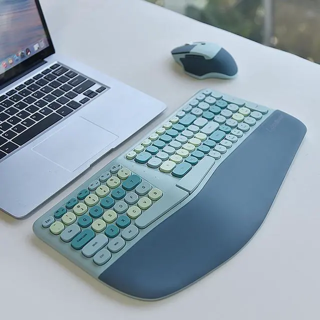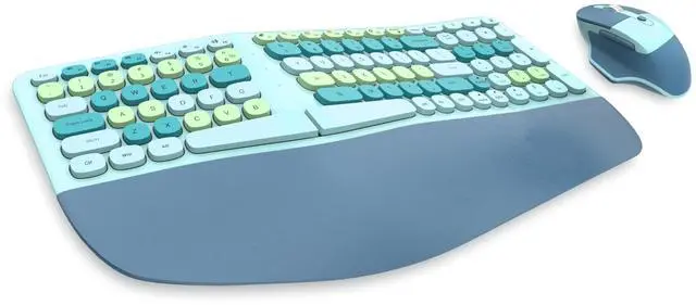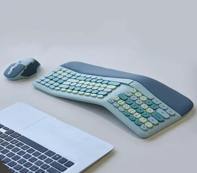 MEMBRANE ERGONOMIC KEYBOARDSplit and sloping keyboard design matches your arms and hands. The low keys can be activated with a light press, reducing typing stress. The integrated wrist rest supports your wrist in a comfortable position. This carpal tunnel keyboard allows you to type in a more natural posture, reducing muscle strain in your wrists and forearms. ^^ WIRELESS CONNECTION 2.4G wireless transmission technology, the maximum transmission distance can reach 10m. The wireless connection solves the desktop clutter problem caused by the data cable, suitable for those who like to have a neat desktop.