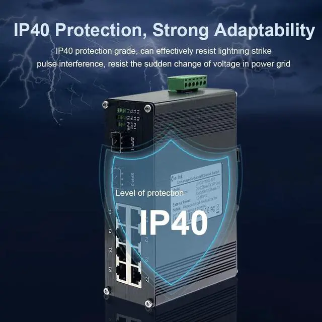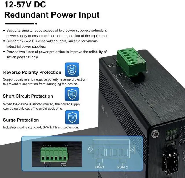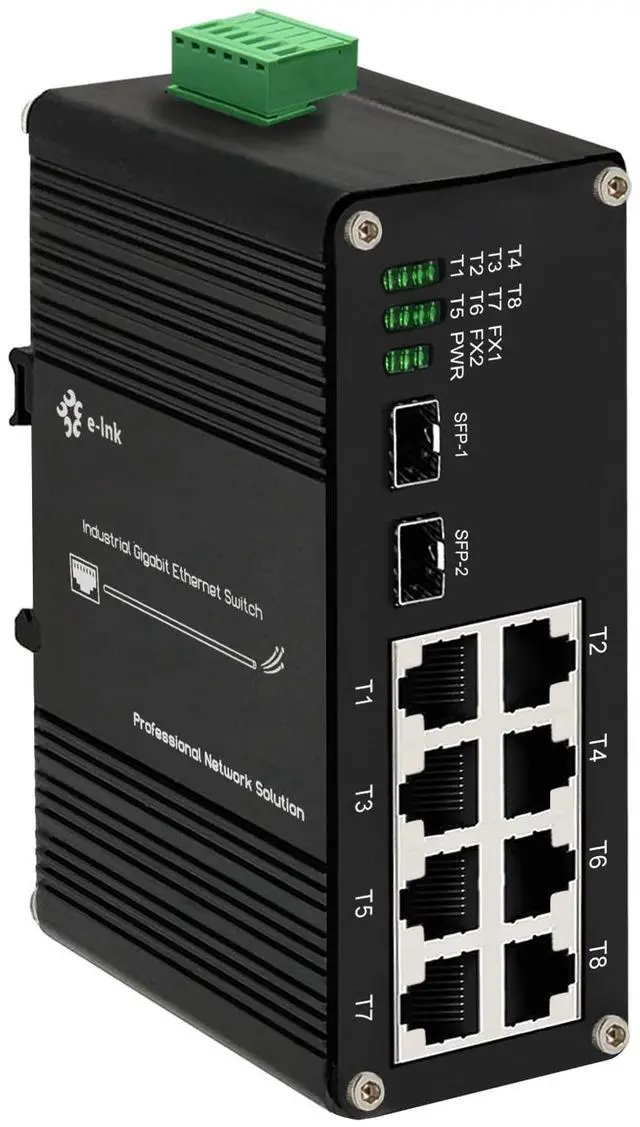 10/100/1000Mbps Ethernet 8 Ports 10/100/1000Mbps Ethernet RJ45 ports Full/Half-duplex, Auto-negotiation, Auto MDI/MDIX. ^^ Industrial Grade Quality Use industrial grade components and aluminum housing, it can work at wide range temperature -40C to 75C (-40F to 167F). You can use it in outdoor harsh environment. ^^ 12~57V DC Input Redundant power The 10 ports Ethernet Switch support 12~57V DC Input, Wide range voltage means you have more choice. And most probably dont need extra power adapter when you have centralized DC power supply. ^^ Support Cascade Connection The industrial Switch with 2 SFP fiber ports, it support cascade connection, and it can save fiber cable resources.