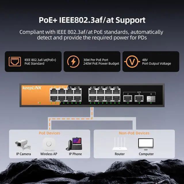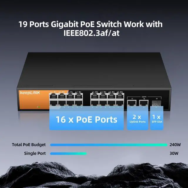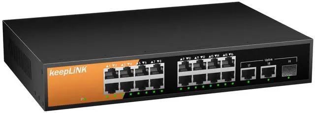 keepLiNK 16-Port Gigabit PoE switch is a high-performance network switch with 16 PoE switch ports, 2 uplink ports, and 1 SFP slot. Each Ethernet switch port delivers up to 30W of power, supporting IEEE 802.3 at/af standards. ^^ Automatically detects PoE switch-compatible devices, supplying power only to them while ensuring data transmission for non-PoE devices. This smart feature enhances efficiency and protects your equipment. ^^ Built with a robust metal casing, this network switch is designed for durability. Ventilation slots on both sides ensure effective heat dissipation, while its fanless design guarantees silent operation.