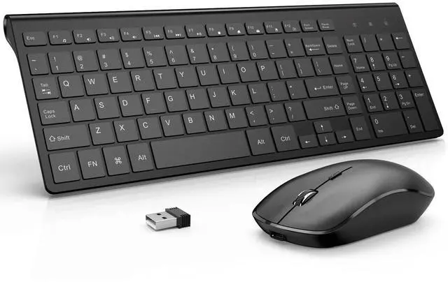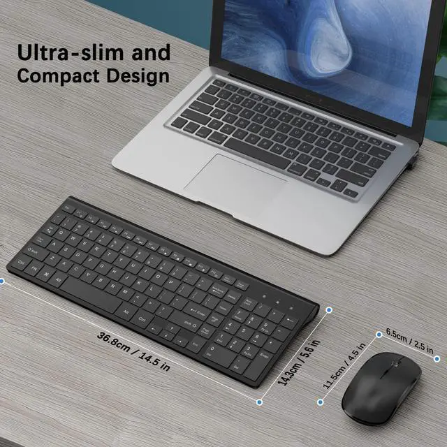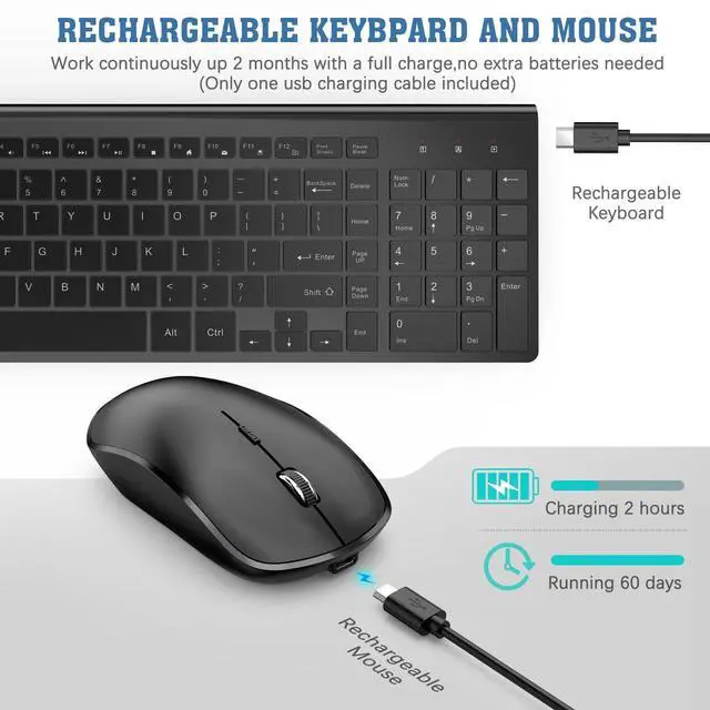 RECHARGEABLE KEYBOARD AND MOUSE COMBO- No need to change batteries any more! Both mouse and keyboard are built in 500mAh lithium rechargeable batteries; one full charge in 1.5 hours, the wireless mouse works for more than 90 days while the wireless keyboard power lasts over 180 days. And both keyboard and mouse will automatcally enter power saving mode if inactivity in 20s. Just click the mouse or hit any key of the wireless keyboard to wake them up. ^^ COMFORTABLE AND LESS NOISE-JOYACCESS wireless keyboard has all keys in scissor-cross mechanism; which maks it ulra-thin (keystroke travel 2mm), light resposive and less noise.