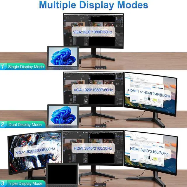 Display Setup: After connection, please check your system's "Display Settings" to ensure all external monitors are detected. You can then choose between "Duplicate" or "Extend" screen modes to suit your needs.