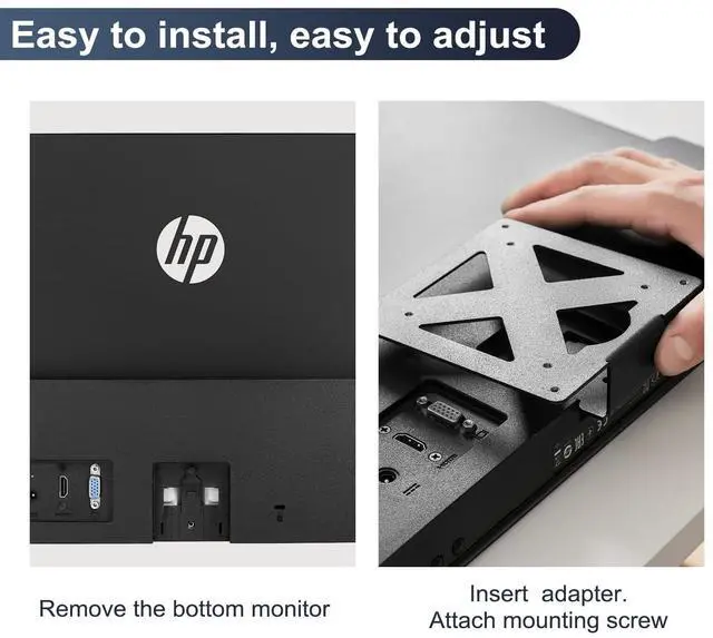 Compatible with HP Pavilion 22M, 24M, 27M (is not compatible with other monitors. ) ^^ Compatible with HP series monitors can be securely mounted to a VESA-compatible stand, arm, or desktop stand for a personalized, ergonomic setup. ^^ Upgrade your workspace today with our VESA Mount Adapter Bracket and enhance your viewing experience with unparalleled versatility and convenience! Elevate your monitor setup to new heights with this essential accessory. ^^ Materials High-quality metal Durable construction ensures long-lasting performance and reliability. Easy Installation Compatible with a wide range of mounting options, the display can be easily integrated into different work environments.