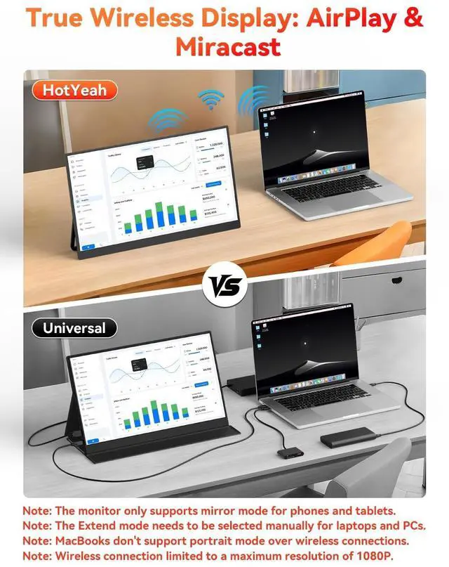 True Wireless Portable Monitor with BatteryExperience ultimate flexibility with this wireless portable monitor that supports AirPlay & Miracast. Simply tap your device's screen casting icon to instantly duplicate or extend your displayno cables needed. This portable monitor for laptop and mobile devices is compatible with iPhone, iPad, Android, MacBook, and Windows systems. Perfect as a portable laptop monitor for remote work or travel.