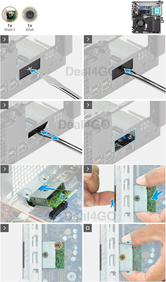 The optional-port module allows you to install the USB-C and Thunderbolt 4 port on the rear panel for Dell Pro Tower Business Desktop Series, insert the board in to the system board.