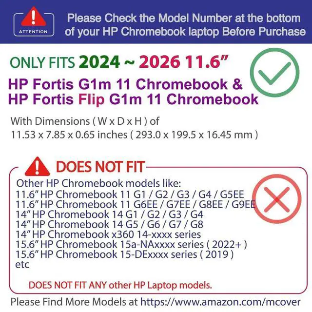 Warning: Every mCover case is custom-designed to fit a specific computer model. PLEASE identify the actual computer model by looking at the bottom of the laptop computer ^^ NOT fitting other 11-inch HP laptops. NOT compatible with ANY other laptops as well. ^^ Made of high-quality translucent polycarbonate material which is shatter-proof and will protect your 2024 - 2026 11.6" HP Fortis G1m 11 clamshell or HP Fortis Flip G1m 11 2-in-1 Chromebook all around ^^ Designed to ONLY fit the 2024 - 2026 11.6" HP Fortis G1m 11 clamshell or HP Fortis Flip G1m 11 2-in-1 Chromebook Notebook Computers with dimension of 11.53 x 7.85 x 0.65 inches ( 293.0 x 199.5 x 16.45 mm ).