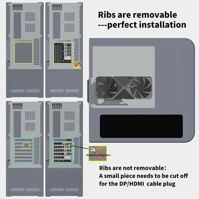 ^^ Please also check if there are ribs between the PCIE slots at the back side of the case, those cases with ribs will block the DP/HDMI cable to plug onto GPU you may need to cut it off a little bit as shown in our picture. ^^ Due to the smart mechanical design and the using of L shape steel, the bracket is strong enough to support current large and heavy GPU like RTX4090, RX7900XTX. ^^ The bracket is low visible.