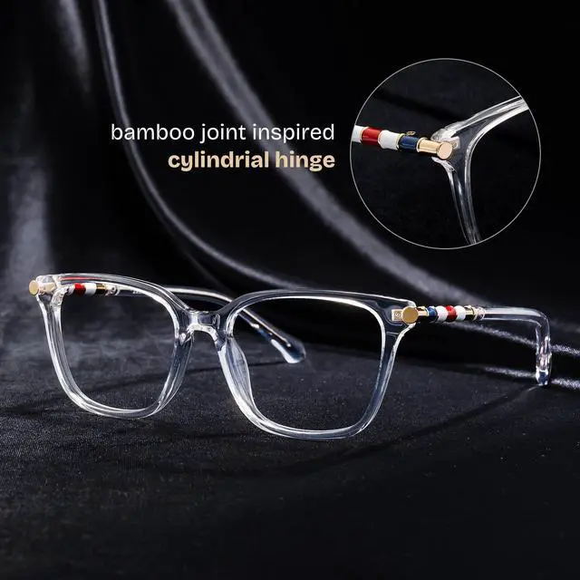 Our blue light blocking glasses comes with UV400 protective lenses, it can protect our eyes from blue light and harmful rays, relieve your vision fatigue and headache at work and in life to get a better sleep ^^ This eyeglasses features a cylindrical hinge design inspired by the joints of bamboo, offering a distinctive and stylish aesthetic that creates an effortlessly elegant vibe ^^ Delilah is a pair of square full-rim eyeglasses with a black mixed finish. It offers a comfortable fit and artistic expression ^^ The preppy style is enhanced by decorative metal accents seamlessly integrated into the frame, making it ideal for everyday use for style-conscious women ^^ This chic pair of eyeglasses is designed with sophisticated metal hinges and integrate nose-pad, it is highly versatile and comfortable