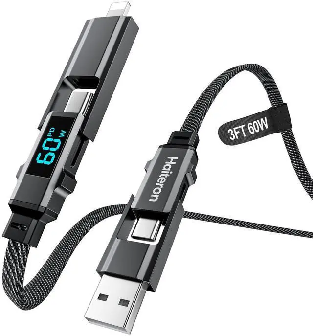 Everything: Universal 4-in-1 Design] Ditch the cable clutter! Haiteron's flat braided cable packs 4 essential connectors in one: USB-C to USB-C, USB-C to Light-ing, USB-A to USB-C, and USB-A to Light-ing. Effortlessly power and connect your iPhone 16/15/14, iPad, Samsung Galaxy, MacBook, iPad, and more. Your ultimate all-in-one charging solution for travel, work, or home. ^^ [Charge at