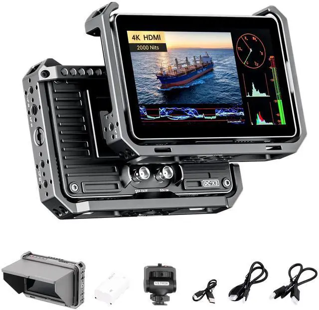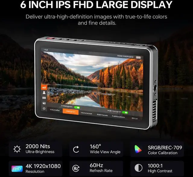 2000 Nits Ultra-brightness Camera MonitorVILTROX DC-X3 touchscreen camera field monitor with 2000 Nits Ultra-brightness display screen, Not Afraid Of Daylight, brightness for outdoor sunlight readable. 6-inch IPS panel with 160 super wide viewing angles, 4K full HD 1920x1080 resolution at 30Hz, SDI interfaces support up to 1080p 60hz video signal, 1000:1 contrast ratio, SRGB/REC-709 color calibration, making you enjoy sharper and richer colors image. ^^ Camera Auxiliary Functions, Custom 3D LUTsThe DC-X3 camera monitor 4k with touch screen has many professional monitoring functions, such as Parade waveform, Oscillogram (Y), vector graph, brightness histogram, auxiliary focus, audio column, image flip, false color, etc.