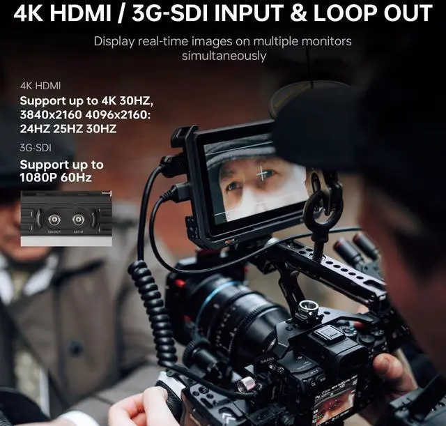 By importing 3D LUT through a USB-A interface and a USB drive, the photographer can achieve various creative effects in the post-editing and use any camera Log mode to shoot and monitor. ^^ 4K HDMI / 3G-SDI Loop In & OutThis camera video monitor features 4K HDMI ports support up to 4K 30Hz, 3840X2160p, 4096X2160p (30/25/24Hz) HDMI signals, 3G-SDI ports support up to 1080p 60Hz video signal, which synchronizes the camera footage clearly to a larger screen, allowing the directors and photographers to watch from different angles and enjoy real-time monitoring. Plus, you can monitor audio using the 3.5 mm stereo headphone jack.